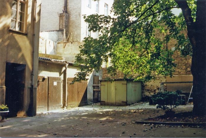 Der Hof 1991 mit der Remisenruine und einer Blechgarage.